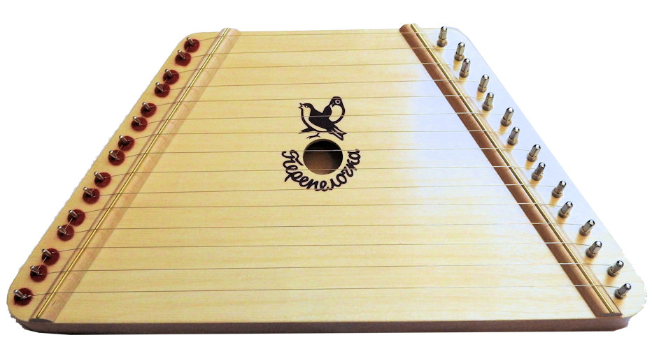 The "Lap Harp" is a plucked string instrument with 15 strings. In the manner of the Harp, each string produces a single note but the instrument is played in a horizontal position. The instrument in our collection is the "Music Maker".